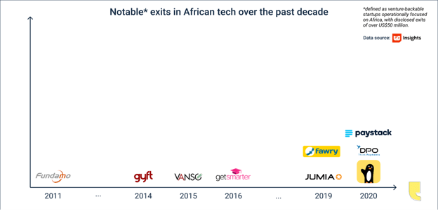 However, 2020 saw some notable exits including World Remit’s acquisition of Sendwave for $500M[2], Network International buying DPO for $288M[3] and Stripe taking over Paystack for $200M[4] to enter the African market as Egypt’s Fawry gain unicorn status.[5] The IPO of Fawry the third Africa tech venture reach market capitalization of over $1 billion to after Jumia[6] and Interswitch[7] was overs subscribed 30 times.